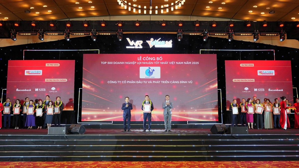 Ngày 28/10/2025 tại Trung tâm hội nghị quốc gia - TP. Hà Nội, Công ty cổ phần Báo cáo Đánh giá Việt Nam (Vietnam Report) phối hợp cùng Báo VietNamNet – Bộ Thông tin và Truyền thông tổ chức Lễ công bố Top 500 Doanh nghiệp có lợi nhuận tốt nhất Việt Nam – PROFIT500; Top 30 Tập đoàn đầu tư chiến lược Việt Nam (ALPHA30) và Top 10 Công ty uy tín ngành Thực phẩm - Đồ uống - Bán lẻ - Bao bì - Nông nghiệp công nghệ cao năm 2025. Công ty cổ phần Đầu tư và Phát triển Cảng Đinh Vũ năm thứ tư liên tiếp vinh dự được trao danh hiệu Top 500 doanh nghiệp có lợi nhuận tốt nhất Việt Nam và lần thứ hai được vinh danh Top 50 doanh nghiệp xuất sắc Việt Nam năm 2025.