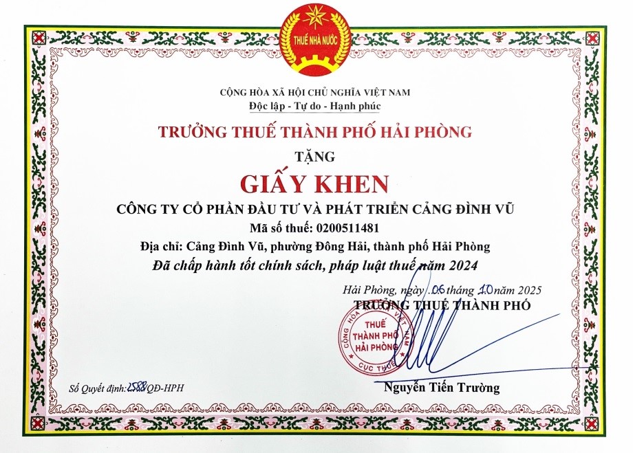 Dự Hội nghị có đại diện lãnh đạo Cục Thuế; các đồng chí lãnh đạo Thuế thành phố Hải Phòng; các Sở, ngành liên quan cùng 139 doanh nghiệp tiêu biểu trên địa bàn. Tại Hội nghị, Cảng Đình Vũ cùng 100 doanh nghiệp, doanh nhân và người nộp thuế tiêu biểu trên địa bàn thành phố Hải Phòng đã được Thuế thành phố tặng Giấy khen vì có thành tích xuất sắc trong việc chấp hành tốt chính sách, pháp luật thuế năm 2024, góp phần tích cực vào công tác thu ngân sách và phát triển kinh tế – xã hội của thành phố.