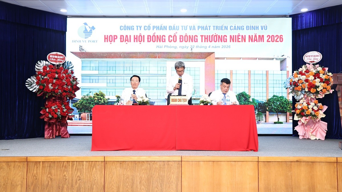 Năm 2026 tiếp tục là một năm đầy thách thức đối với Cảng Đình Vũ, các mục tiêu SXKD vẫn ở mức rất cao: sản lượng container thông qua 650.000 teu; doanh thu 820 tỷ đồng; lợi nhuận trước thuế 460 tỷ đồng, cổ tức dự kiến tối thiểu 70% vốn điều lệ. Tập thể lãnh đạo và CBCNV Cảng Đình Vũ quyết tâm thực hiện tốt các giải pháp đề ra trong báo cáo của HĐQT và phấn đấu hoàn thành các chỉ tiêu. Chương trình họp Đại hội đồng cổ đông thường niên năm 2026 của Cảng Đình Vũ kết thúc thành công lúc 17h15’ ngày 22/4/2026.