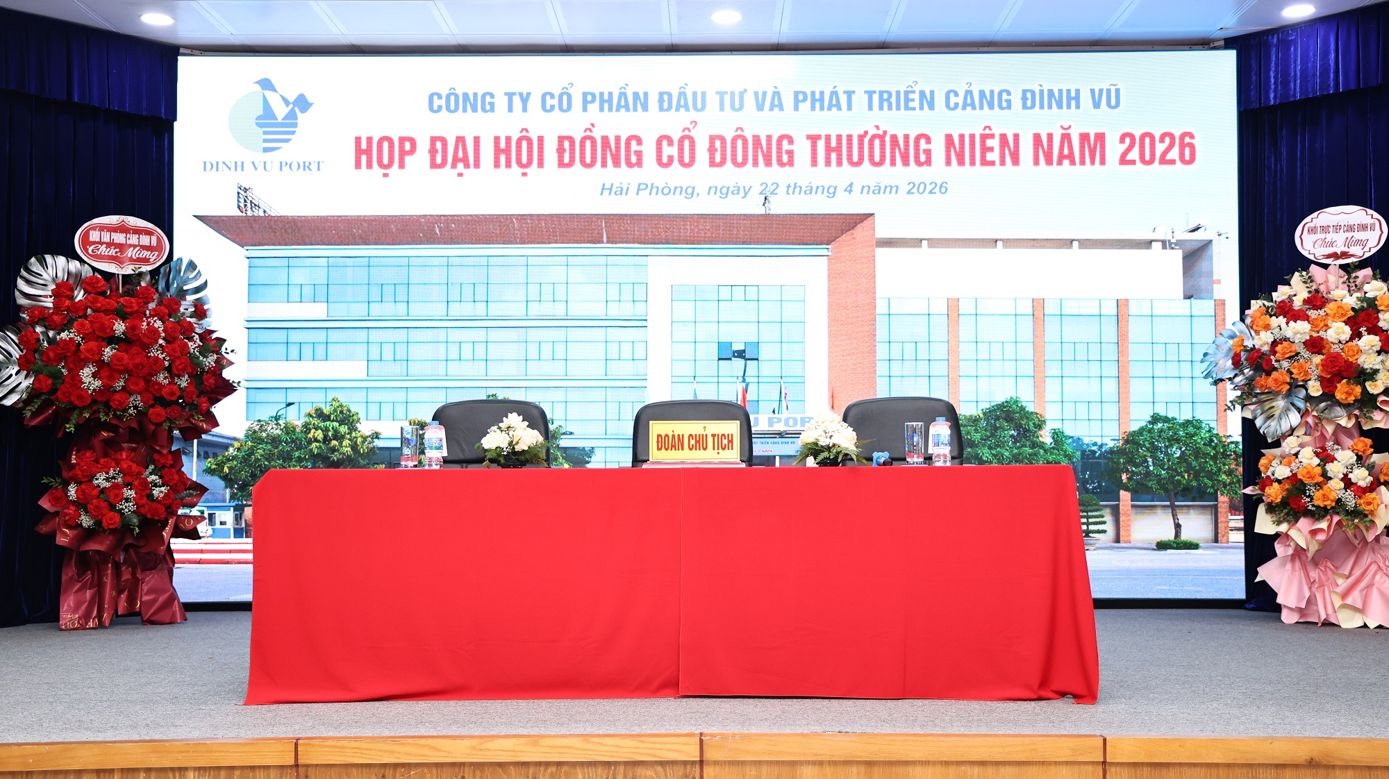 Chiều ngày 22/4/2026, Công ty Cổ phần Đầu tư và Phát triển Cảng Đình Vũ tổ chức họp Đại hội đồng cổ đông thường niên năm 2026 tại Hội trường tầng 5 Công ty, phường Đông Hải, thành phố Hải Phòng. Chương trình có sự tham gia dự họp của 165 cổ đông hiện hữu theo danh sách chốt quyền tham dự ngày 26/3/2026.