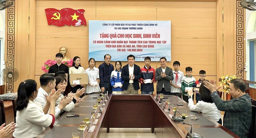 Hưởng ứng Thư kêu gọi số 214/UBND-VHXH ngày 18/11/2025 của UBND xã Hòa An – tỉnh Cao Bằng, Công ty CP Đầu tư và Phát triển Cảng Đình Vũ đã ủng hộ số tiền 50.000.000 đồng hỗ trợ kinh phí cho các học sinh, sinh viên trên địa bàn Xã Hòa An, Tỉnh Cao Bằng có hoàn cảnh khó khăn đạt thành tích cao trong học tập. Ngày 20/12/2025, đoàn lãnh đạo và cán bộ nhân viên Cảng Đình Vũ đã có chuyến công tác tại xã Hòa An, tỉnh Cao Bằng để trao quà cho 08 cháu học sinh, sinh viên thuộc diện vươn lên vượt khó và có thành tích cao trong năm học 2024-2025.