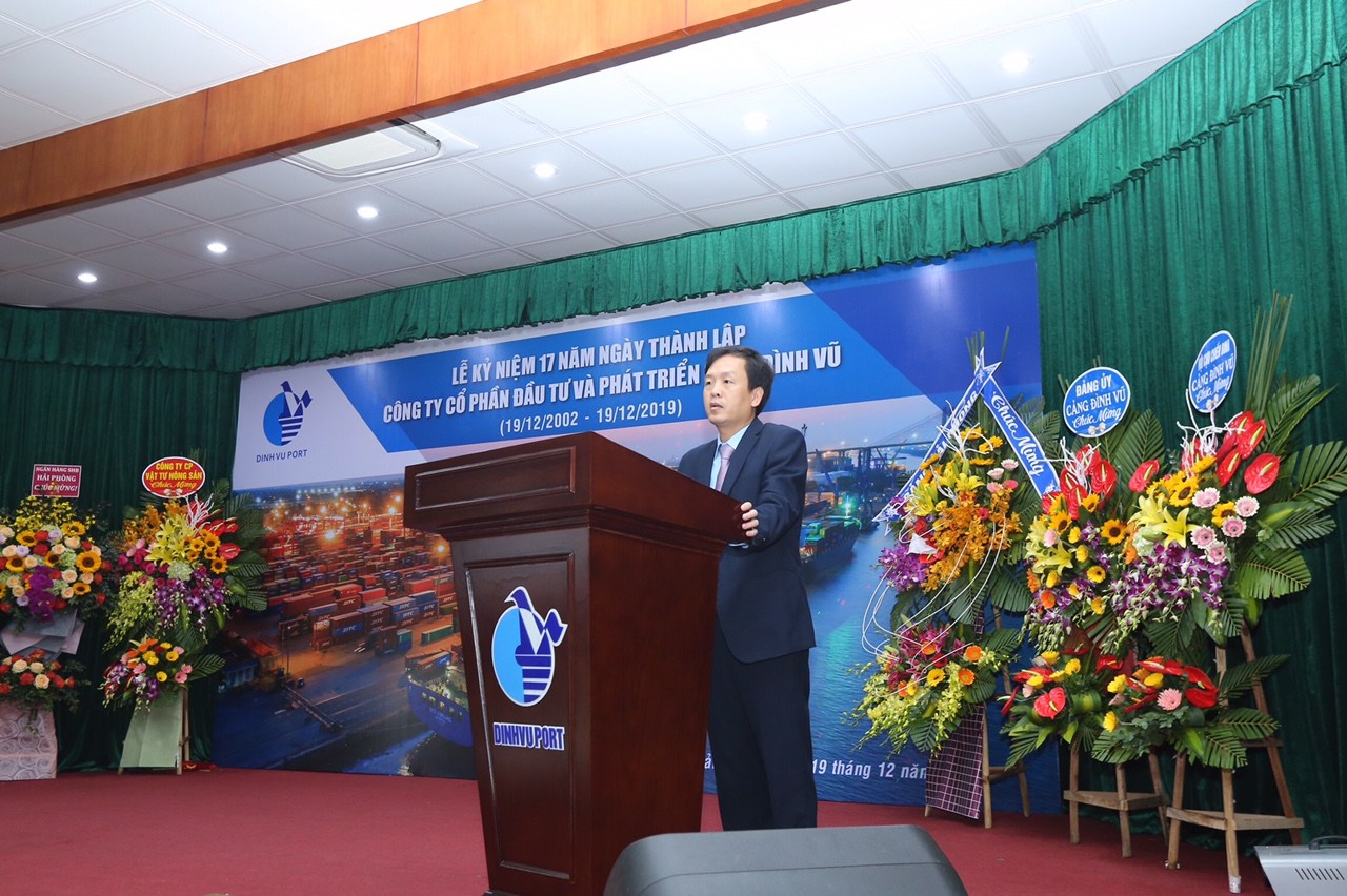 Phát biểu chúc mừng tại buổi lễ, Ông Phạm Hồng Minh – Phó bí thư Đảng ủy, Chủ tịch Hội đồng quản trị Công ty Cổ phần Cảng Hải Phòng đánh giá cao và ghi nhận thành tích mà Cảng Đình Vũ đã đạt được trong năm 2019 cũng như trong những năm gần đây; đồng thời gửi lời chúc tới Ban lãnh đạo và toàn thể CBCNV Cảng Đình Vũ sẽ luôn đoàn kết, quyết tâm vượt qua những khó khăn để hoàn thành và hoàn thành vượt mức các chỉ tiêu trong năm 2020 và giai đoạn sắp tới.