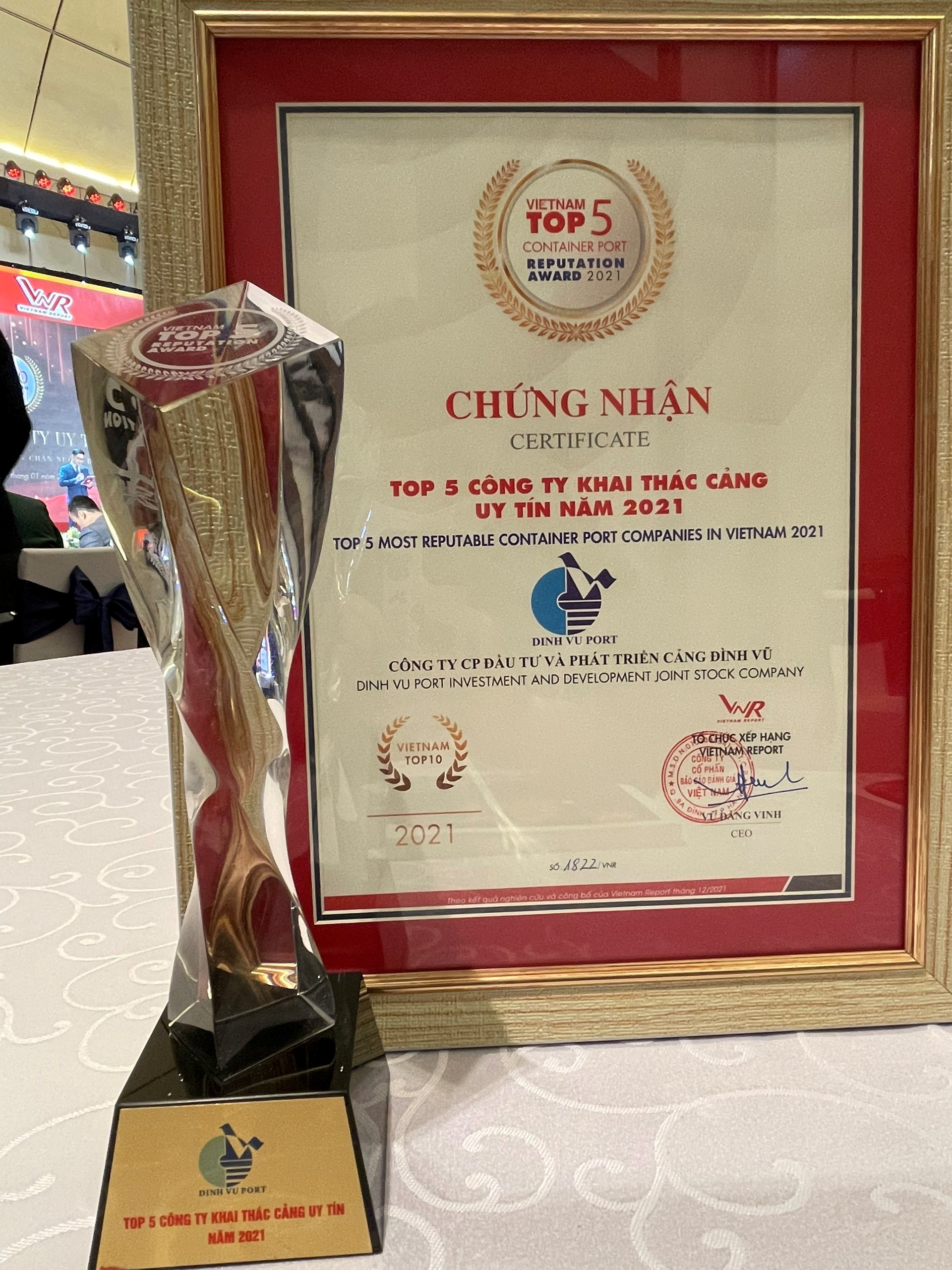 Ngày 14/01/2022 tại Trung tâm Hội nghị Quốc gia Việt Nam, TP. Hà Nội, Công ty cổ phần Báo cáo Đánh giá Việt Nam (Vietnam Report) phối hợp cùng Báo VietNamNet – Bộ Thông tin và Truyền thông chính thức tổ chức Lễ công bố Top 500 Doanh nghiệp lớn nhất Việt Nam & Top 10 Công ty uy tín các ngành nghề lĩnh vực. Với thành tích xuất sắc về sản lượng, doanh thu, lợi nhuận Công ty cổ phần Đầu tư và Phát triển Cảng Đinh Vũ vinh dự được trao Cup và Chứng nhận Top 5 Công ty khai thác cảng uy tín năm 2021.