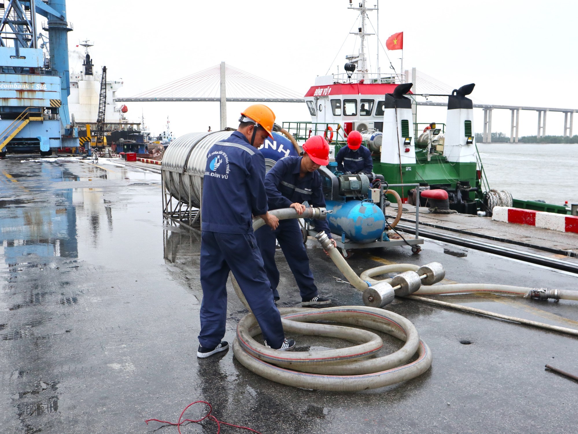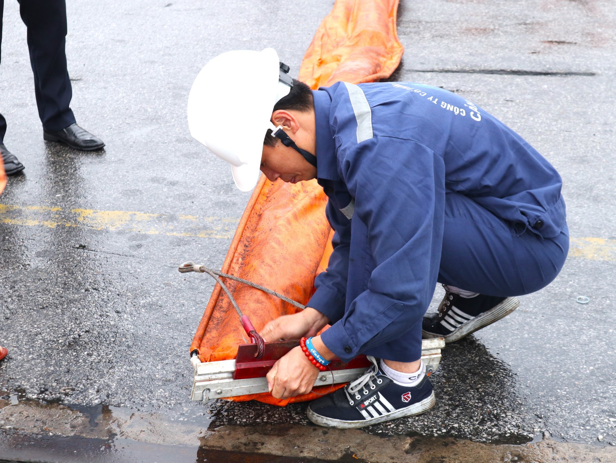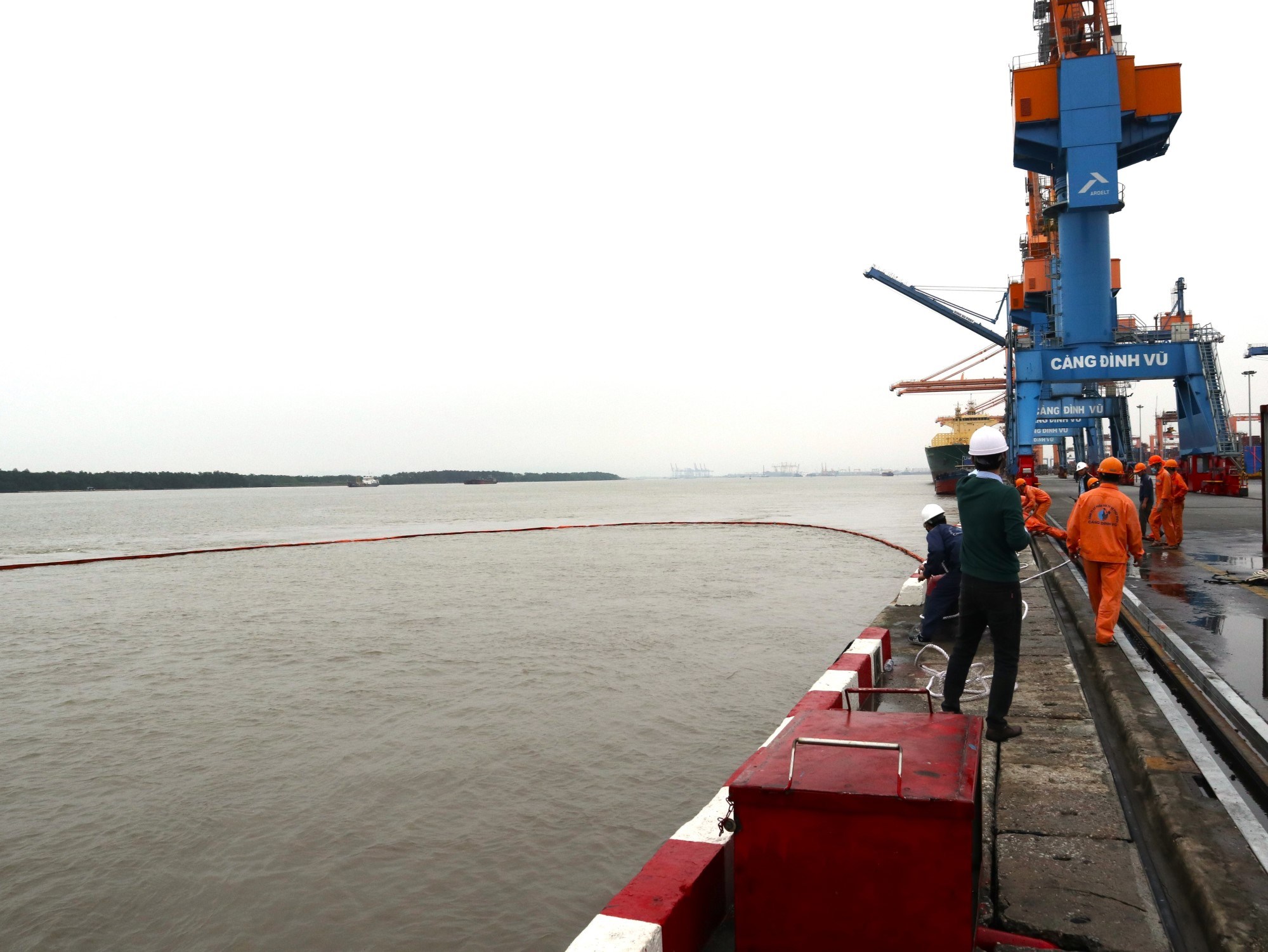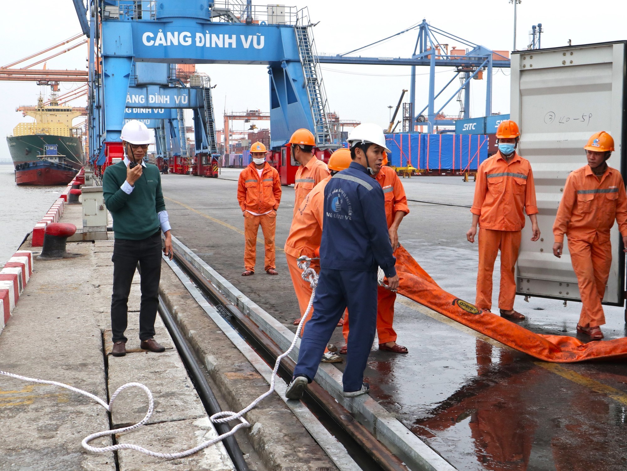 Cuối chương trình thực tập chiều ngày 04/12/2023 là nội dung diễn tập ứng phó sự cố tràn dầu với sự chỉ đạo chính của sỹ quan An ninh cảng biển Cảng Đình Vũ, cán bộ Trực ban chỉ đạo, lực lượng công nhân Bốc xếp và công nhân Tổ điện trạm Phòng Kỹ thuật. Các thành viên tham gia nội dung diễn tập ứng phó sự cố tràn dầu đã chuẩn bị đầy đủ các thiết bị, vật dụng cần thiết cũng như thực hiện nghiêm túc các quy định và thao tác đúng hướng dẫn đối với chương trình diễn tập tại doanh nghiệp.