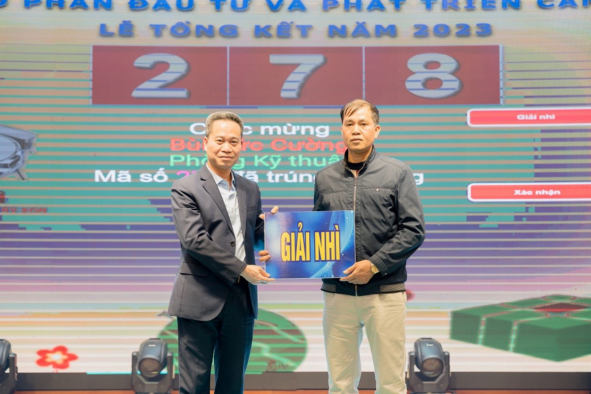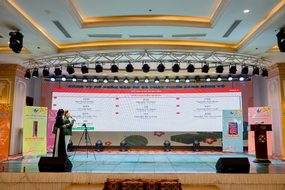 Nội dung Quay số may mắn năm 2023 có nhiều nét đổi mới với tổng số 179 giải thưởng (90 giải may mắn, 60 giải khuyến khích, 20 giải Ba, 06 giải Nhì, 02 giải Nhất và 01 giải Đặc biệt). Danh sách mã số và thông tin nhân viên trúng giải được quay ngẫu nhiên thông qua phần mềm vi tính, được bấm quay số trực tiếp từ điện thoại có kết nối bluetooth và kết quả được hiển thị rõ ràng trên màn hình lớn để tất cả khán giả tham dự có thể theo dõi từ mọi vị trí. Với các giải may mắn, khuyến khích và giải ba sẽ được Phòng Hành chính tập hợp danh sách và gửi cho đại diện các đơn vị; 9 giải cao nhất người trúng giải sẽ được lãnh đạo Công ty trao biển tượng trưng trên sân khấu và nhận quà hiện vật tại Phòng Hành chính từ ngày 31/01/2024.