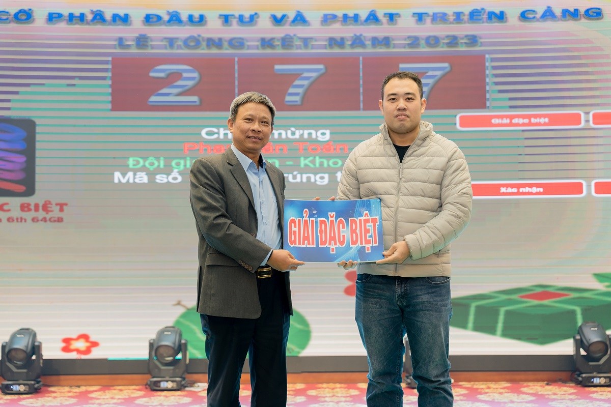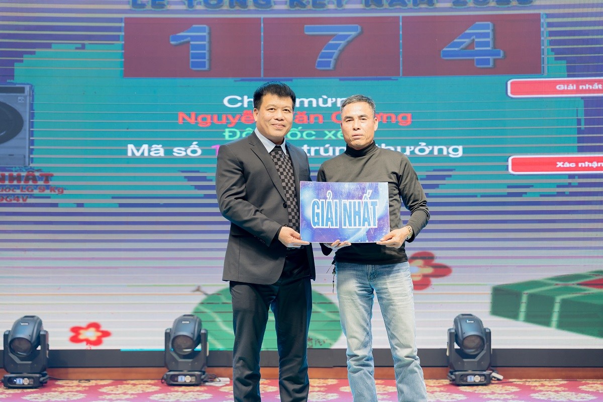 Các giải thưởng trong chương trình quay số may mắn hàng năm đều mang tính sử dụng cao và thiết thực trong đời sống hàng ngày trong đó 2 giải Nhất năm nay là máy giặt LG tích hợp tính năng sấy vô cùng tiện lợi trong mùa đông thuộc về anh Nguyễn Văn Cường – Đội Bốc xếp và anh Phùng Thế Cường – Đội Cơ giới; 01 giải Đặc biệt là máy tính bảng Ipad mini thuộc về anh Phan Văn Toán mã số 277 đến từ Đội Giao nhận kho hàng. Nụ cười và niềm vui của những cá nhân lên sân khấu nhận giải ngoài việc thể hiện may mắn của mỗi người còn minh chứng cho sự khích lệ lớn lao của ban lãnh đạo dành cho những nỗ lực và cống hiến của tập thể người lao động xuyên suốt một năm qua.
