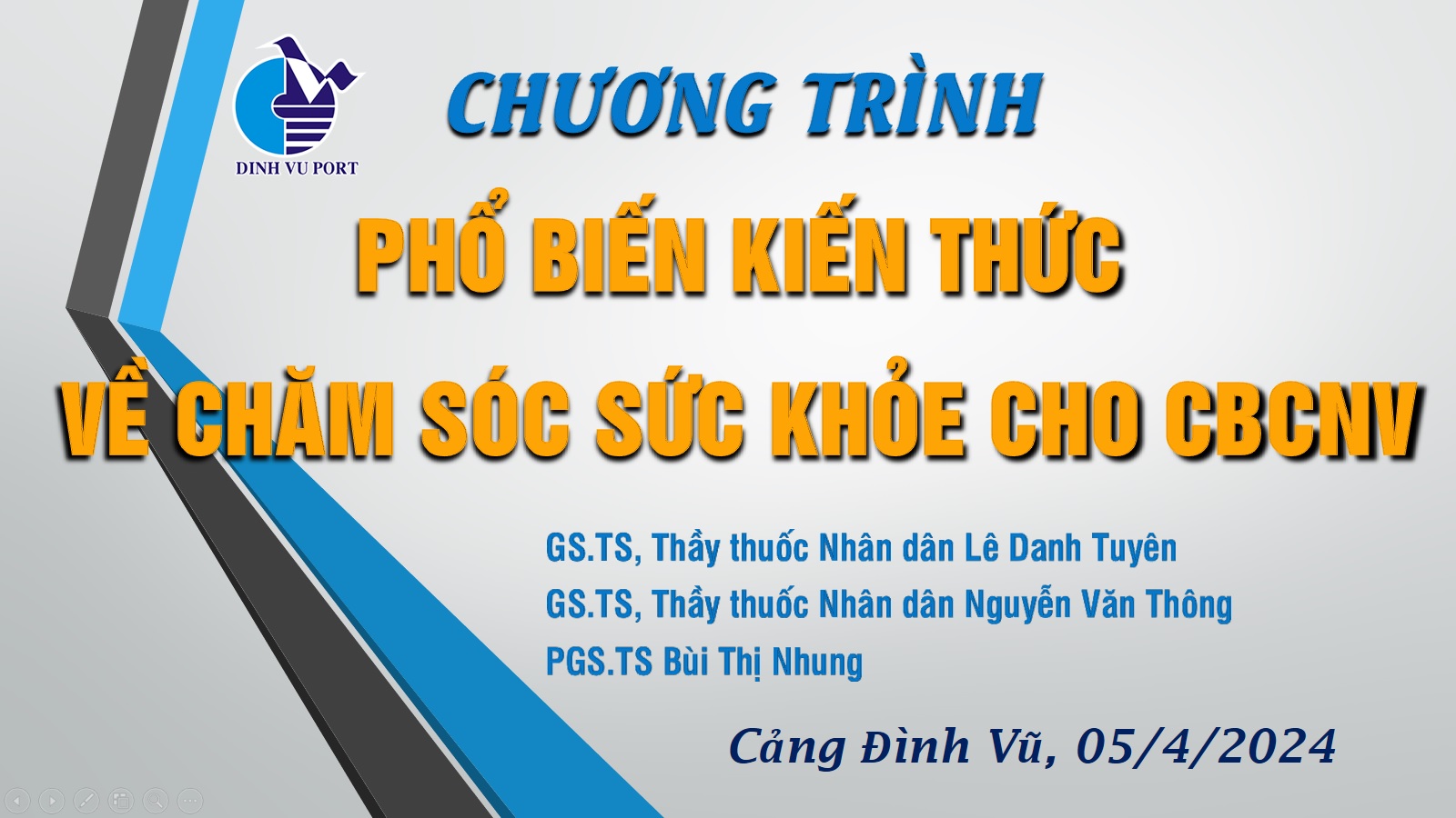 Ngày 05/4/2024 Công ty cổ phần Cảng Đình Vũ tổ chức chương trình phổ biến kiến thức chăm sóc sức khỏe cho CBCNV tại Hội trường tầng 5 Công ty. Chương trình có sự tham dự của Ban lãnh đạo Công ty cùng đông đảo CBCNV các phòng ban. Cảng Đình Vũ vinh dự mời và tiếp đón các chuyên gia trong lĩnh vực dinh dưỡng và chăm sóc sức khỏe tham gia tư vấn, phổ biến các kiến thức bổ ích cho người lao động.