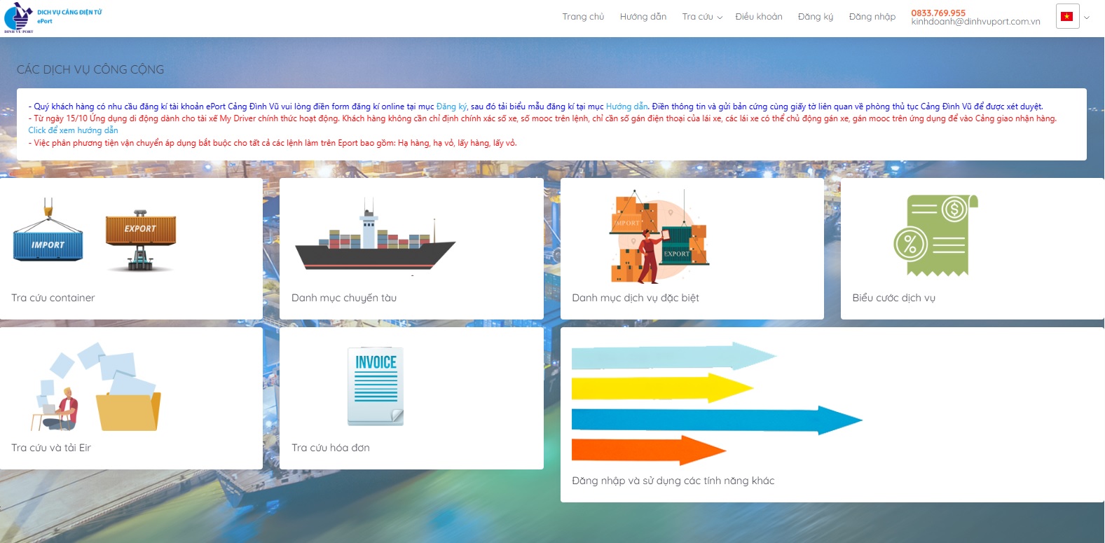 Ngày 15/10/2024, Cảng Đình Vũ chính thức triển khai dịch vụ cảng điện tử - ePort (sau thời gian áp dụng thí điểm từ ngày 16/9/2024) với nhiều tiện ích vượt trội nhằm hỗ trợ tối đa khách hàng sử dụng các dịch vụ tại cảng: