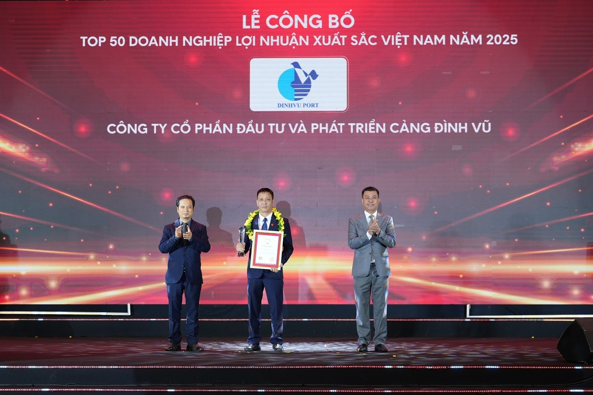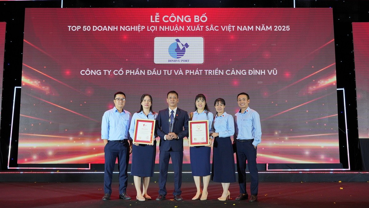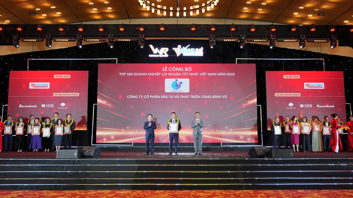 Ngày 28/10/2025 tại Trung tâm hội nghị quốc gia - TP. Hà Nội, Công ty cổ phần Báo cáo Đánh giá Việt Nam (Vietnam Report) phối hợp cùng Báo VietNamNet – Bộ Thông tin và Truyền thông tổ chức Lễ công bố Top 500 Doanh nghiệp có lợi nhuận tốt nhất Việt Nam – PROFIT500; Top 30 Tập đoàn đầu tư chiến lược Việt Nam (ALPHA30) và Top 10 Công ty uy tín ngành Thực phẩm - Đồ uống - Bán lẻ - Bao bì - Nông nghiệp công nghệ cao năm 2025. Công ty cổ phần Đầu tư và Phát triển Cảng Đinh Vũ năm thứ tư liên tiếp vinh dự được trao danh hiệu Top 500 doanh nghiệp có lợi nhuận tốt nhất Việt Nam và lần thứ hai được vinh danh Top 50 doanh nghiệp xuất sắc Việt Nam năm 2025.