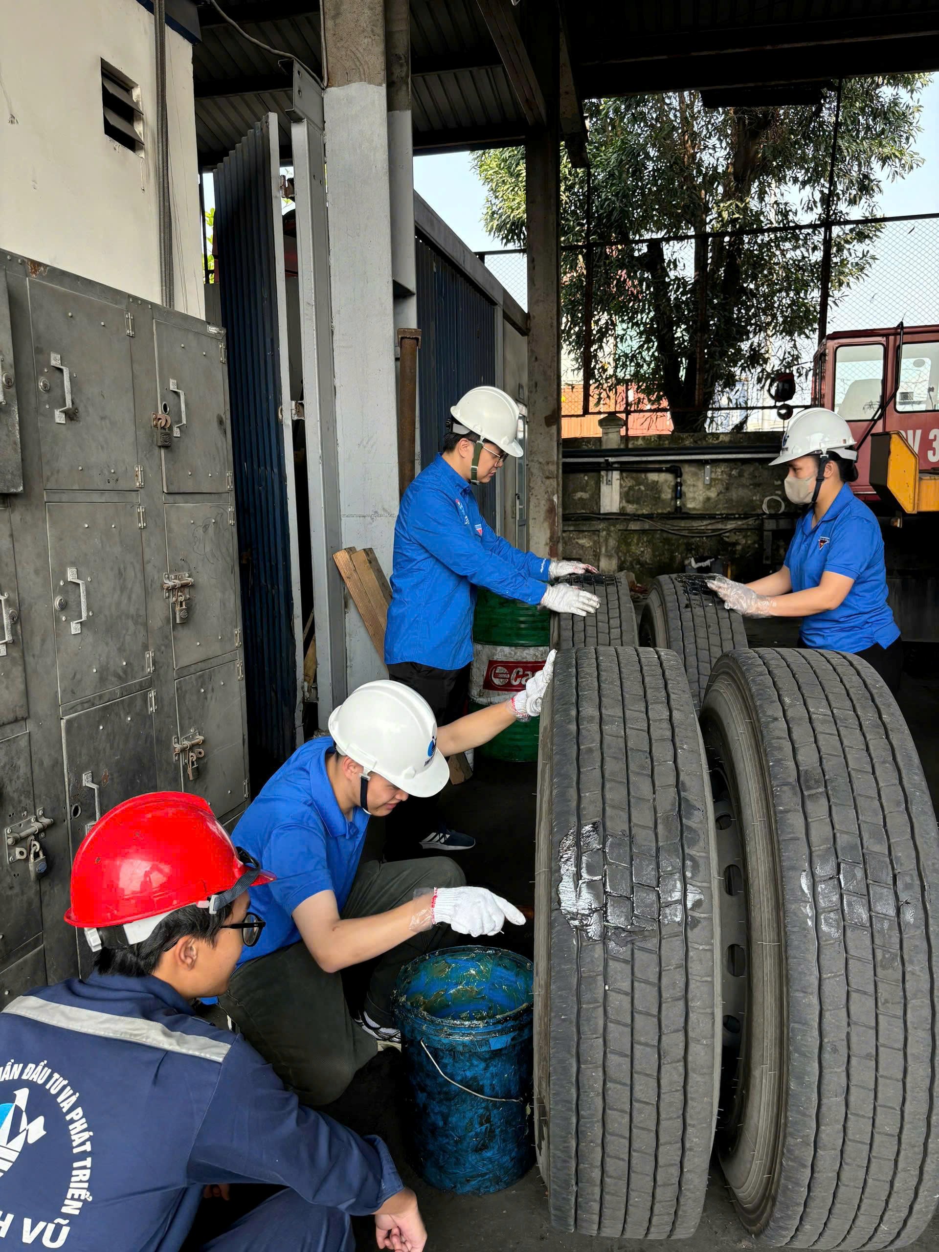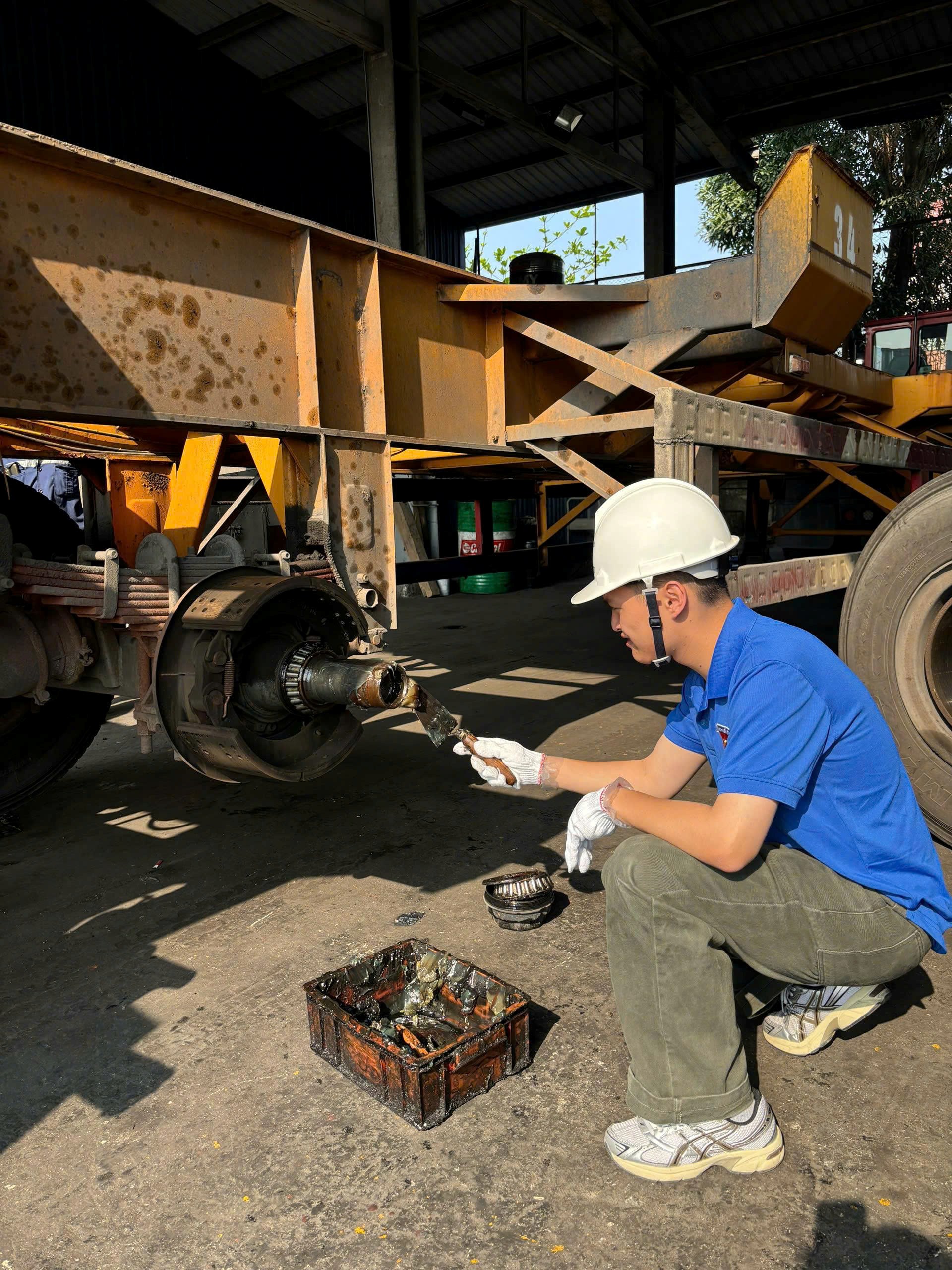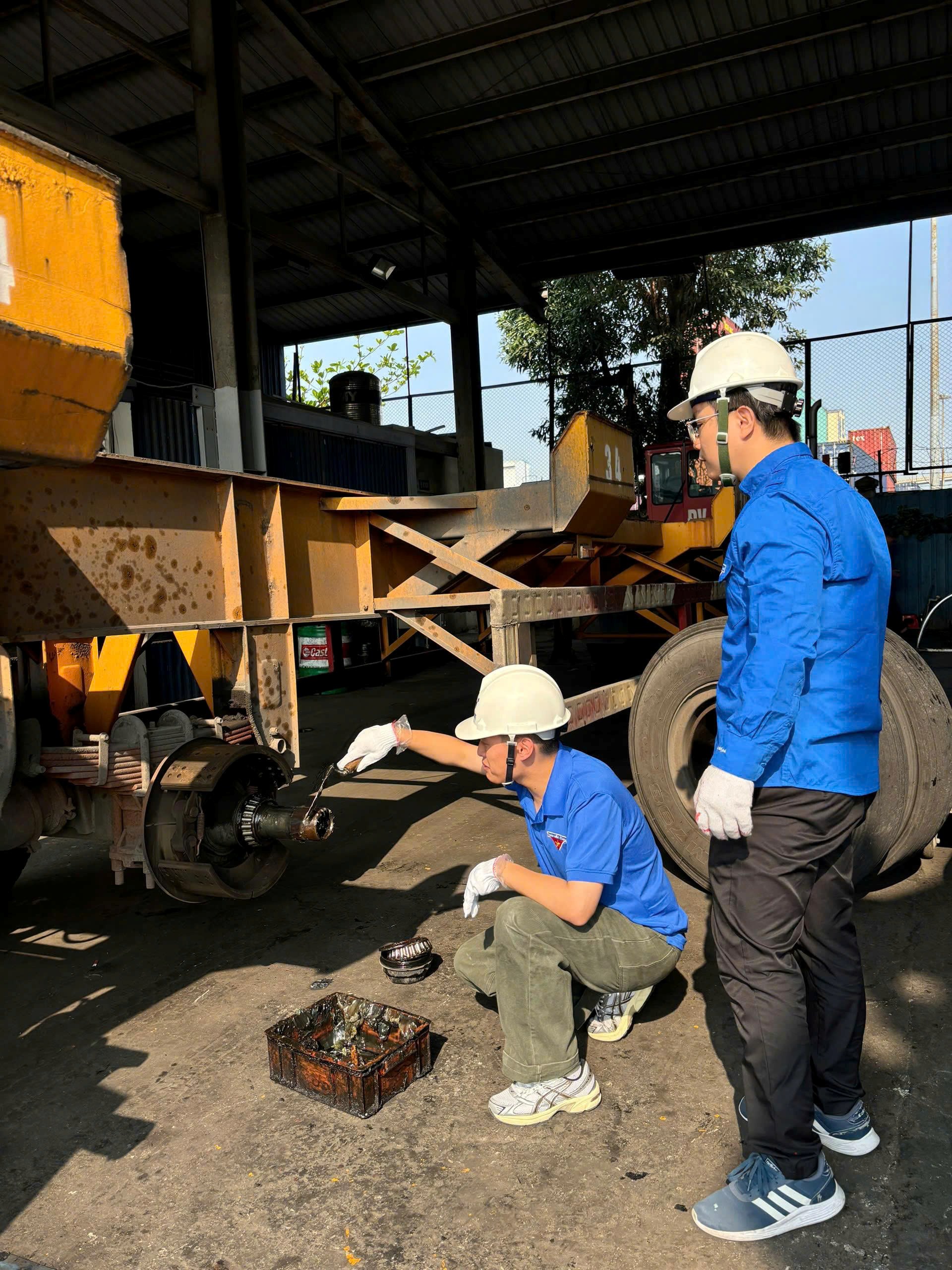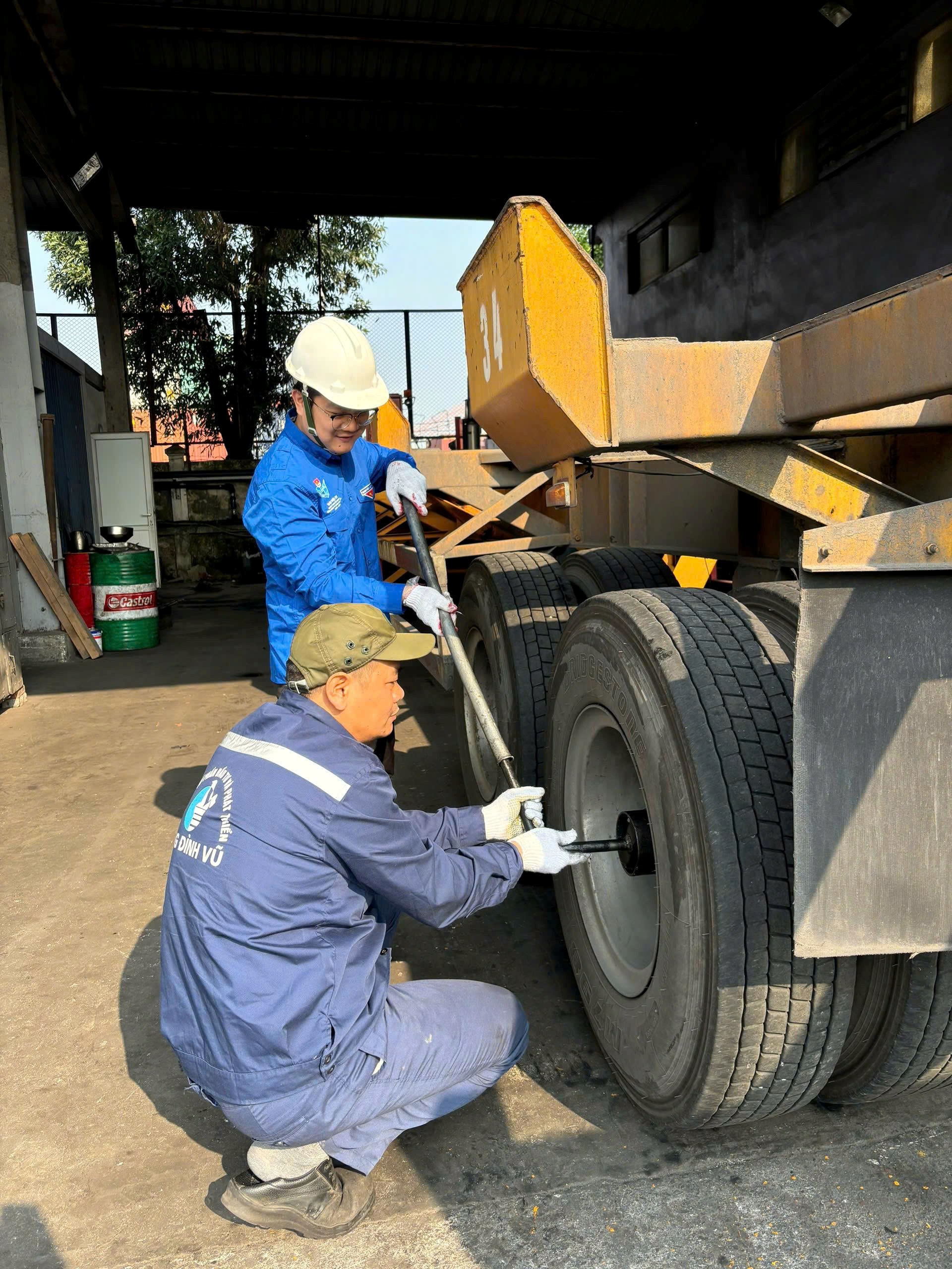 Trong ngày 13/3/2026, với tinh thần trách nhiệm cao và sự phân công nhiệm vụ khoa học, 06 đoàn viên thanh niên Công ty đã triển khai thực hiện công trình và hoàn thành khối lượng công việc đề ra: bảo dưỡng hệ thống moay ơ đầu kéo và rơ-mooc xe vận chuyển mang số hiệu DV34.