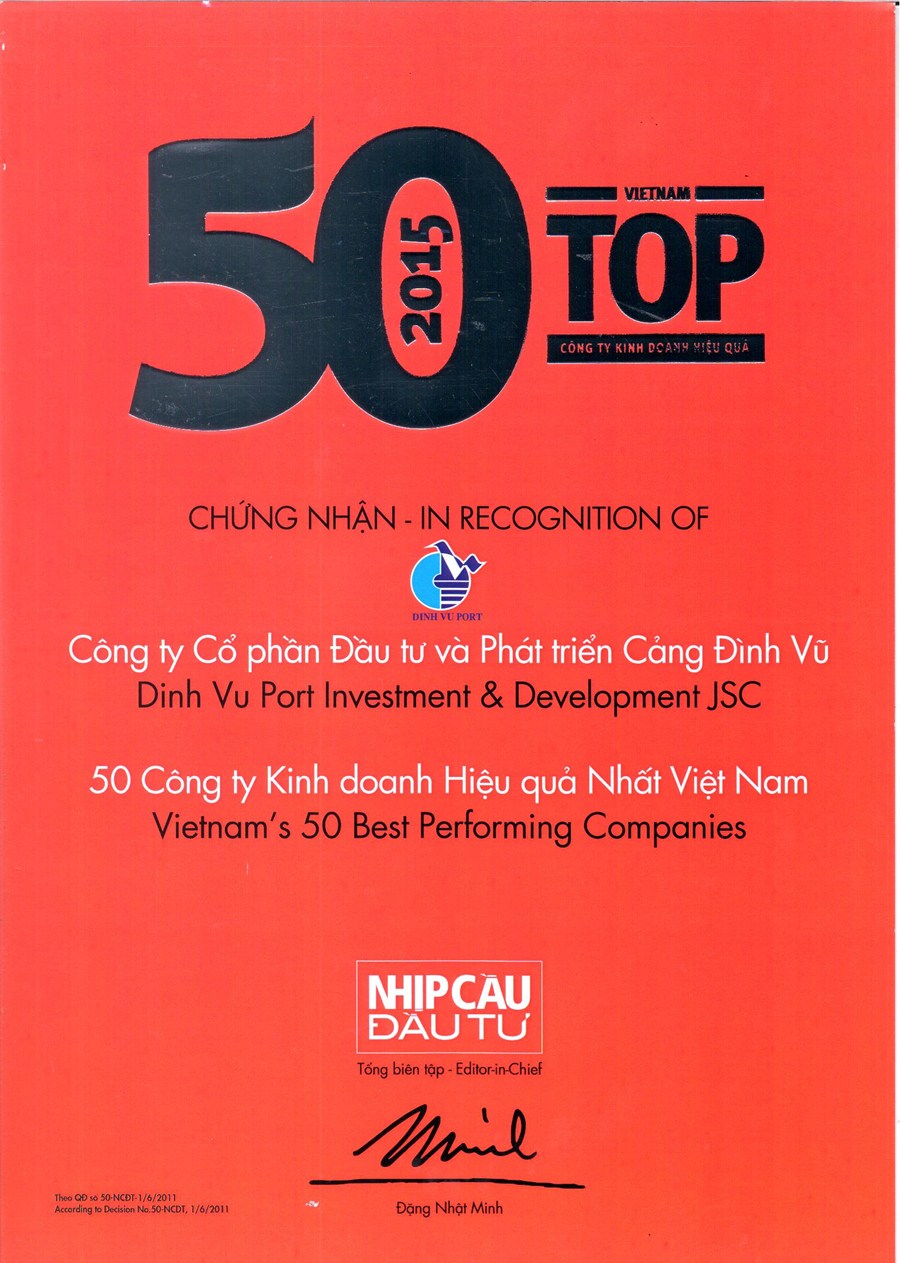 Thg6 16 Lần thứ tư liên tiếp Cảng Đình vũ lọt vào Top 50 Công ty kinh doanh hiệu quả nhất Việt nam Dinh Vu Port Tin công ty 16 Tháng Sáu 2016 Ngày 16/06/2016, tại GEM Center, Thành phố Hồ Chí Minh, Tạp chí Nhịp cầu Đầu tư phối hợp cùng Công ty Chứng khoán Thiên Việt long trọng tổ chức Lễ Công bố Danh sách Top 50 Công ty kinh doanh hiệu quả nhất Việt nam 2016. Xem chi tiết