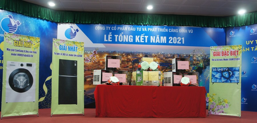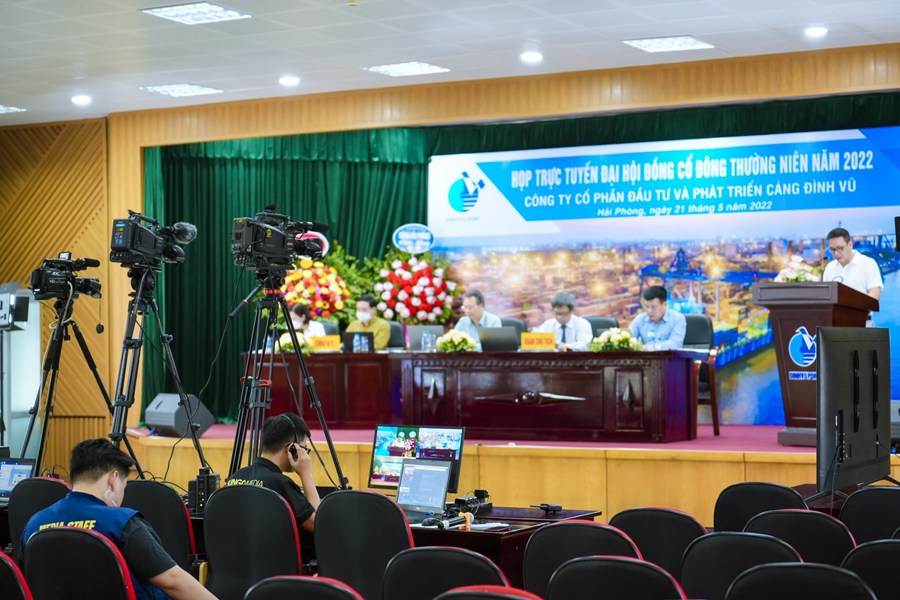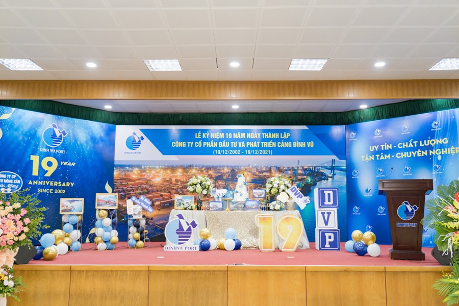 Chiều ngày 21/01/2022, Công ty Cổ phần Đầu tư và Phát triển Cảng Đình Vũ tổ chức Lễ tổng kết năm 2021 và phát động kế hoạch sản xuất kinh doanh năm 2022 theo hình thức kết hợp tham dự trực tiếp tại Hội trường Công ty và trực tuyến 6 điểm cầu Giao nhận kho hàng, Cơ giới, Bốc xếp, Trực ban – ATLĐ, Tổ thủ tục tính cước và Bãi container Cảng Đình Vũ.